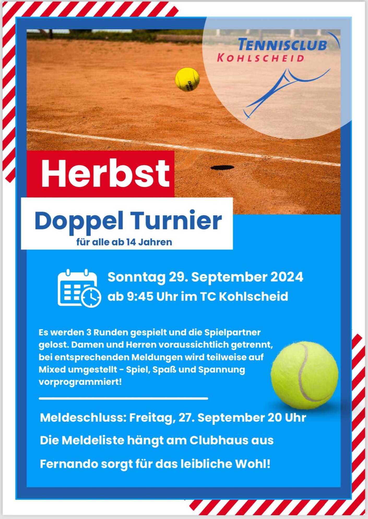 am Sonntag, den 29. September 2024 findet unser diesjähriges Herbst-Doppel-Turnier statt.