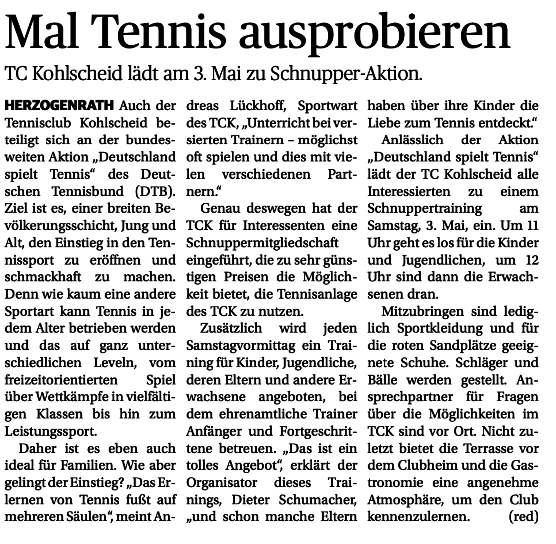 Anlässlich der Aktion „Deutschland spielt Tennis“ lädt der TC Kohlscheid alle Interessierten zu einem Schnuppertraining am Samstag, den 03.05.2025 ein.
