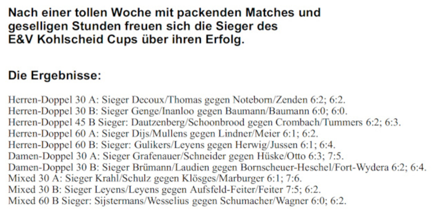 Ergebnisse des Engel & Völkers Kohlscheid-Cup 2019