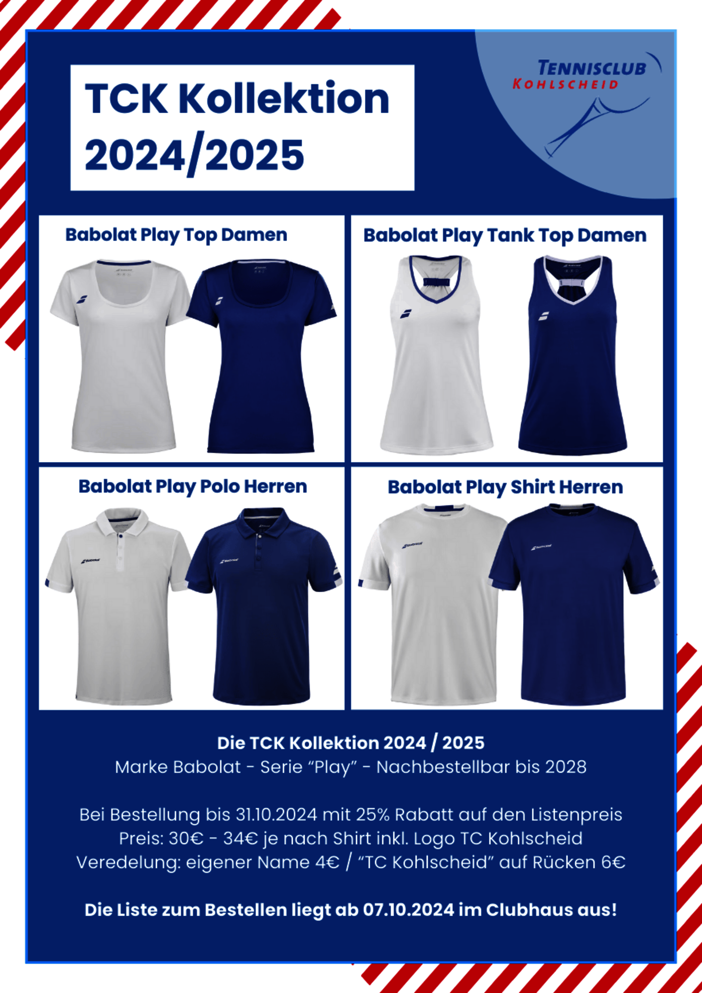 Leider sind unsere bisherigen Vereinsshirts der Firma Babolat nicht mehr lieferbar. In Zusammenarbeit mit unserem Vereinssponsor Ivo’s Sportshop aus Simpelveld haben wir die neue Kollektion „Play“ der Firma Babolat ausfindig gemacht, die eine Nachkaufgarantie bis 2028 bietet.